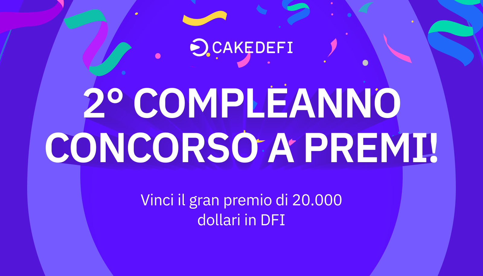 Cake DeFi Anniversary PromotionJulian Hosp, CEO e co-fondatore di Cake DeFi, ha detto: "Siamo entusiasti di celebrare il nostro secondo anniversario e vorremmo cogliere questa opportunità per restituire alla nostra comunità in rapida crescita, che è sempre stata motivata a sostenere la nostra missione e visione a lungo termine. Tornando indietro al 2019, il nostro team si è rapidamente evoluto ed avanzato per creare un servizio semplice, sicuro, affidabile e trasparente per i nostri utenti. Per ringraziare di cuore la nostra preziosa comunità che ci ha sostenuto lungo la strada, siamo entusiasti di annunciare il nostro concorso a premi “Lotteria dell' Anniversario” nel nostro secondo anniversario, dando ai nostri utenti la possibilità di vincere premi per un totale di oltre 27.000 dollari".